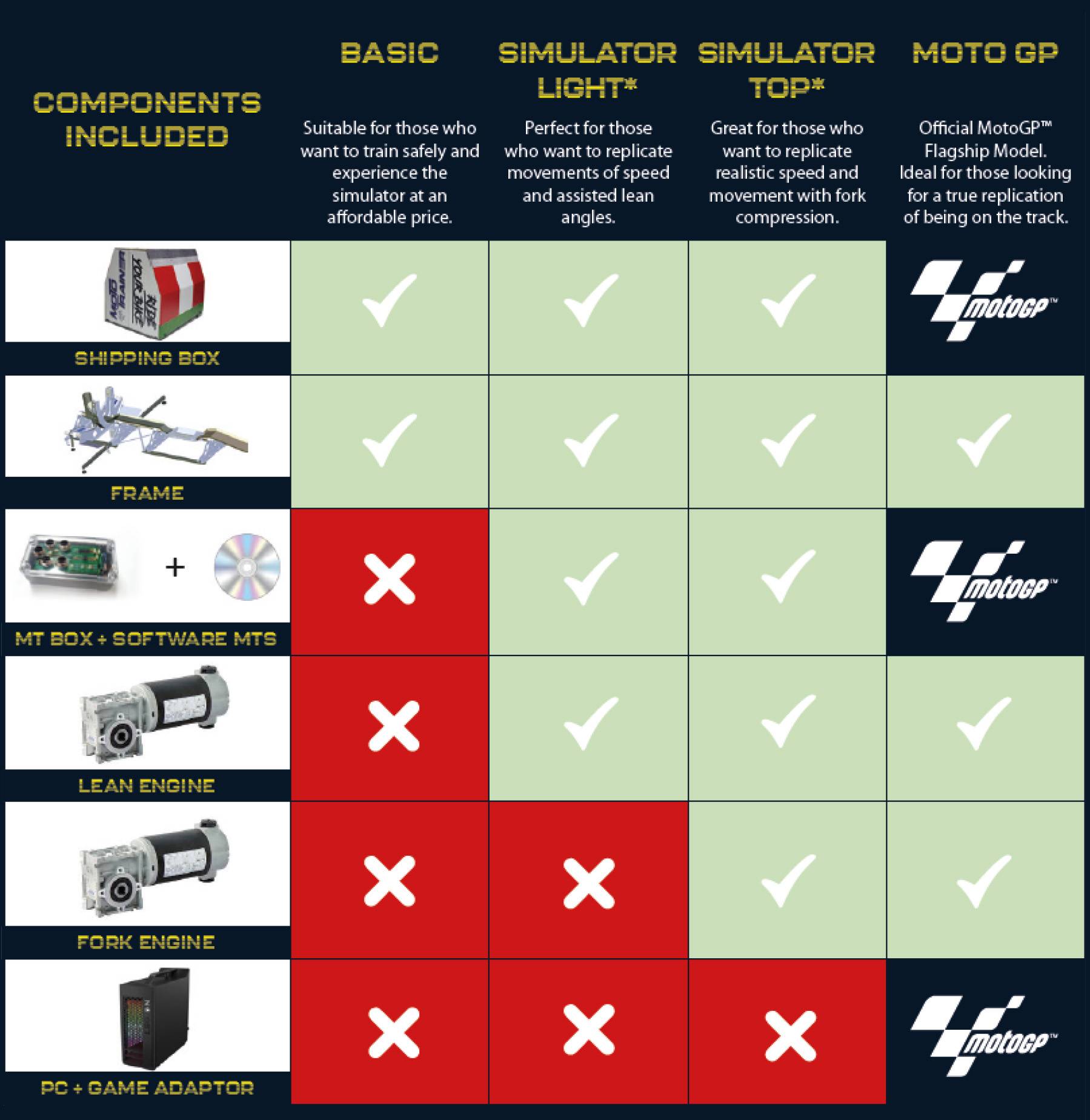 Karakteristika Moto Trainera je upravo ta da može vjerno reproducirati osjećaje brze vožnje na motociklu. Moto Trainer je jedini simulator koji koristi pravi motocikl i postiže kutove nagiba do 50°. Također ima podesiv međuosovinski razmak pa je pogodan za sve sportske motocikle, a lako je prenosiv jer se sklapa u jednu kutiju smanjenih dimenzija.